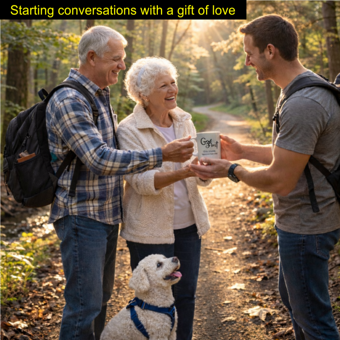 His name was Mitch, and during our conversation, I asked if he believed in God. He responded, “Yes,” then said he was about to ask me a similar question because he felt the love of Jesus in us earlier. While speaking, I reached into my backpack, told him I wanted to give him something, and began retrieving a God First cup with its messages. While doing so, explaining, “I don’t want to give this gift to someone who won’t appreciate it, which is why I asked if you believed in God.” As Mitch took the cup of inspiration, he was extremely appreciative.